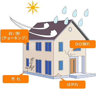 ・外壁材や内部そのものにダメージを与える 常時、自然にさらされることで、内部の造作より 塗料の劣化によって外壁材の保護機能が低下した部分には雨が浸透しやすくなり、 モルタルや建材本体・建材内部のカビや腐食に繋がることがあり、 外壁の剥がれ、反りかえし等が発生しやすくなります